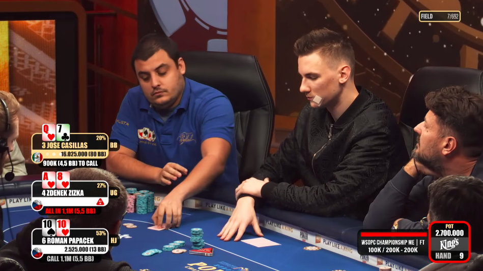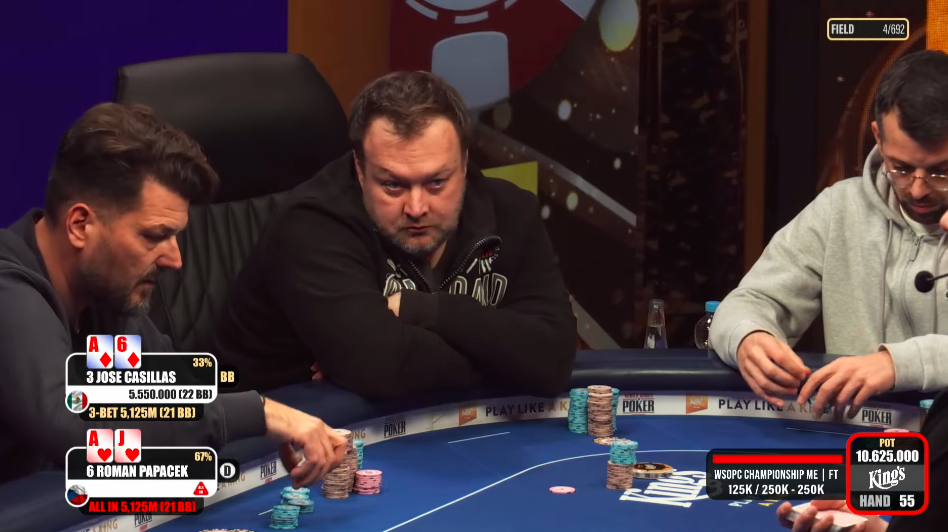 Supershort Artiom Poddubnii brzy padá s K-J do A-5 Casillase. Zbývají čtyři hráči. Papáček s Jobinem se pohybují mezi 15-20 bigy, Vrakas s Casillasem v rozmezí 40-60, na chiplead se vrátil Mexičan