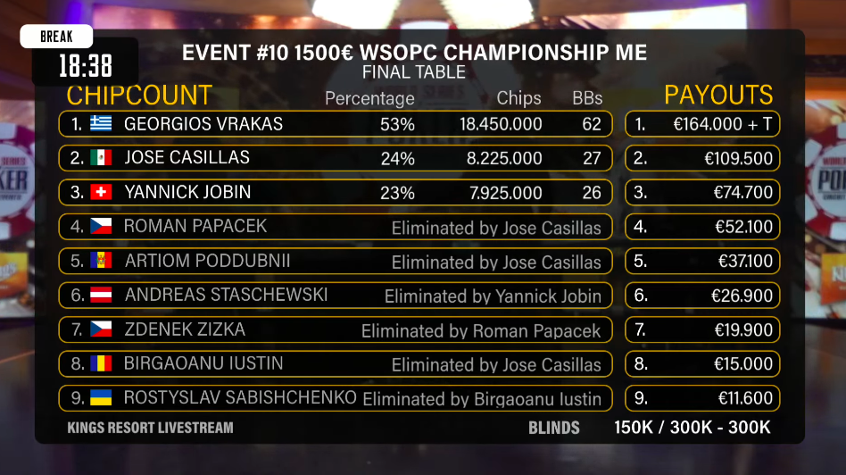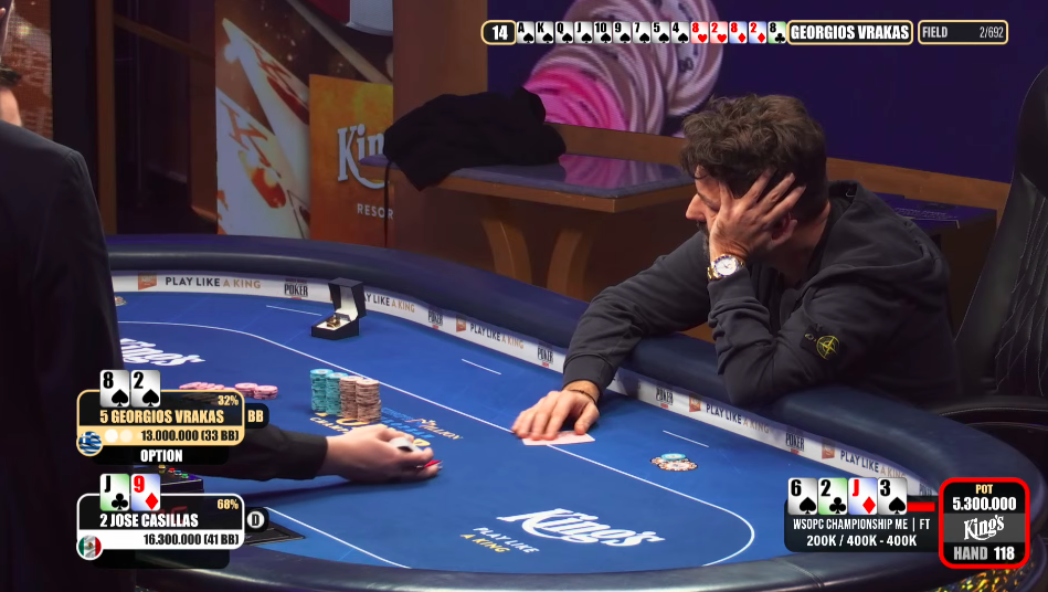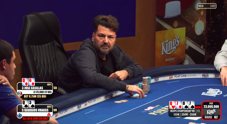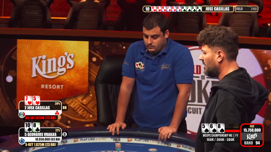 Georgios Vrakas doublí, když mu jde barva na river a dostává se tak na velký chiplead. Casillas se ale ještě do breaku dokáže vrátit do hry.