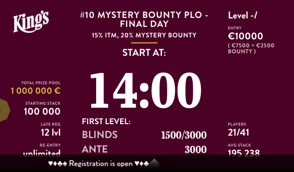 Zatím pouze 41 entries počítá WSOPE event #10 - Mystery Bounty PLO v rozvadovském King's Resortu. Přitom při buy-inu €10.000 je garance €1.000.000 postavena na rovných 100 vstupů.