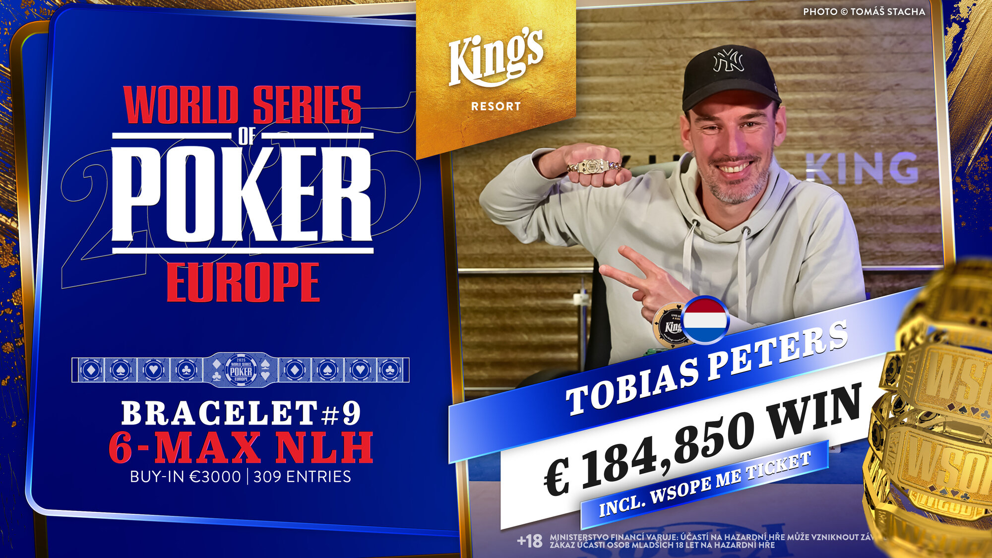 Další náramek World Series of Poker Europe zná svého majitele, v eventu #9 WSOPE 6-Max ho získal holandský profesionál, Tobias Peters. Nejlepšími CZ/SK zástupci byli, na 14. příčce Stanislav Koleno a na 28. místě Jan Bednář.