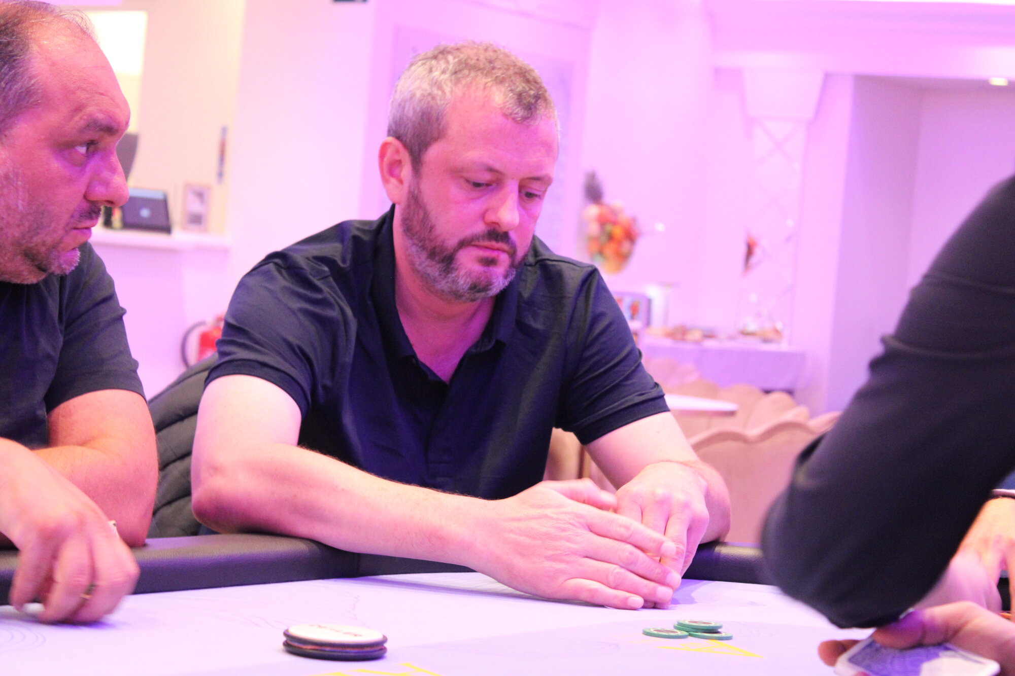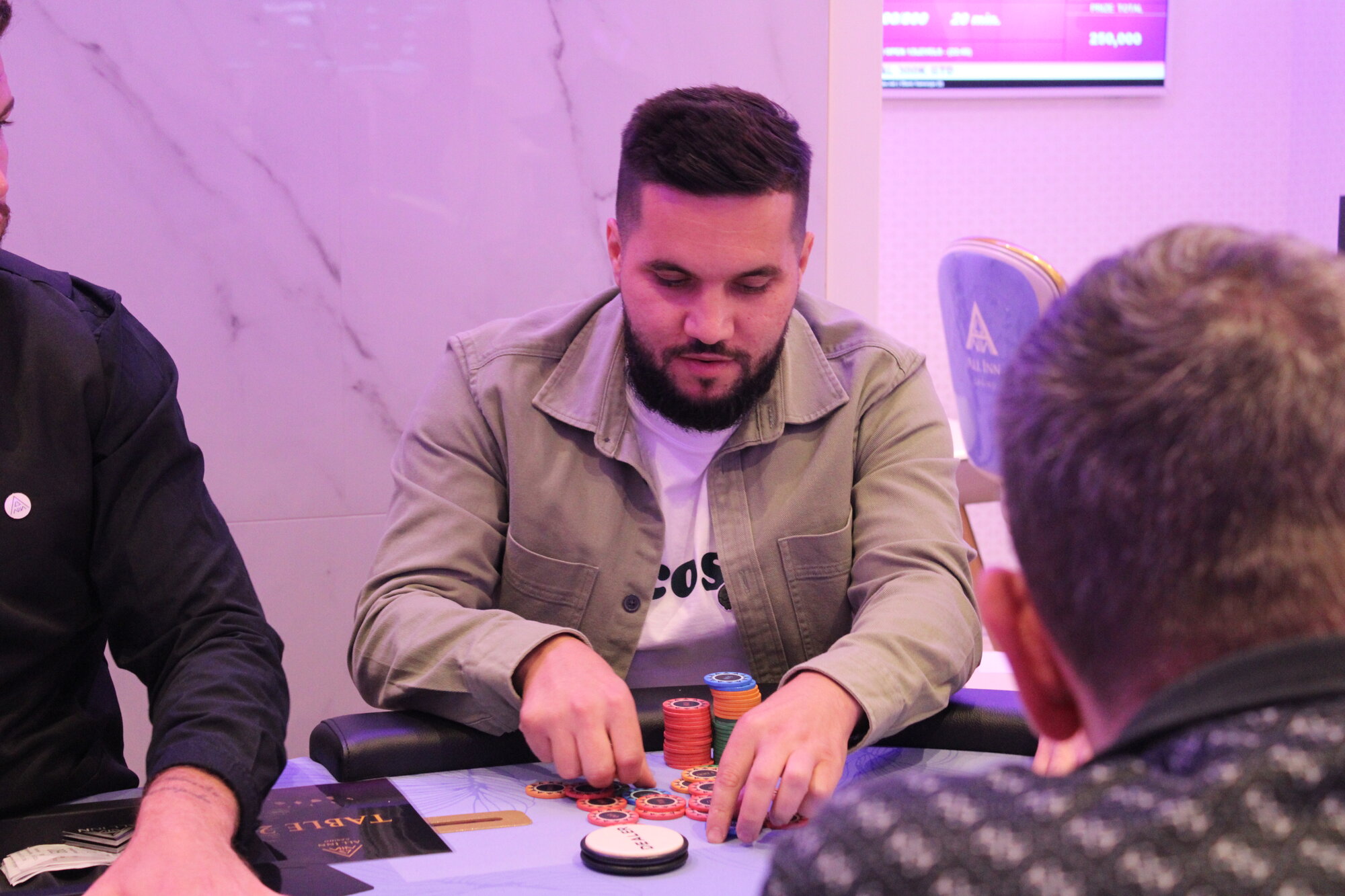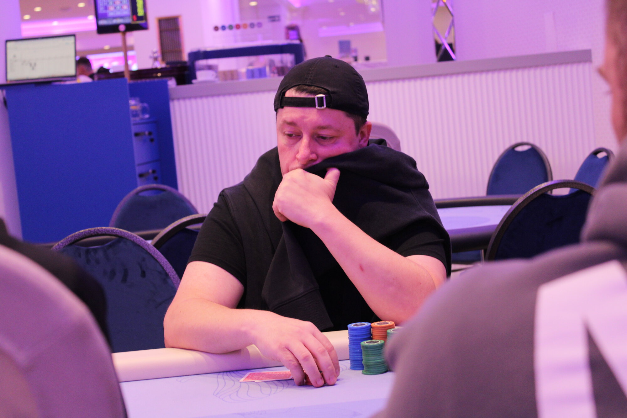 Karlovarský Král (BTN) open 150k, Marián Cmor (BB) allin 800k, call.