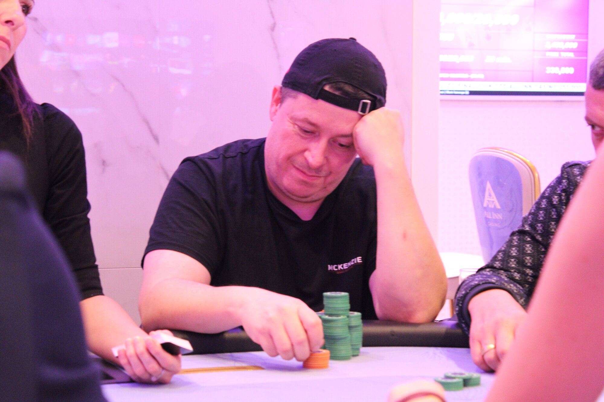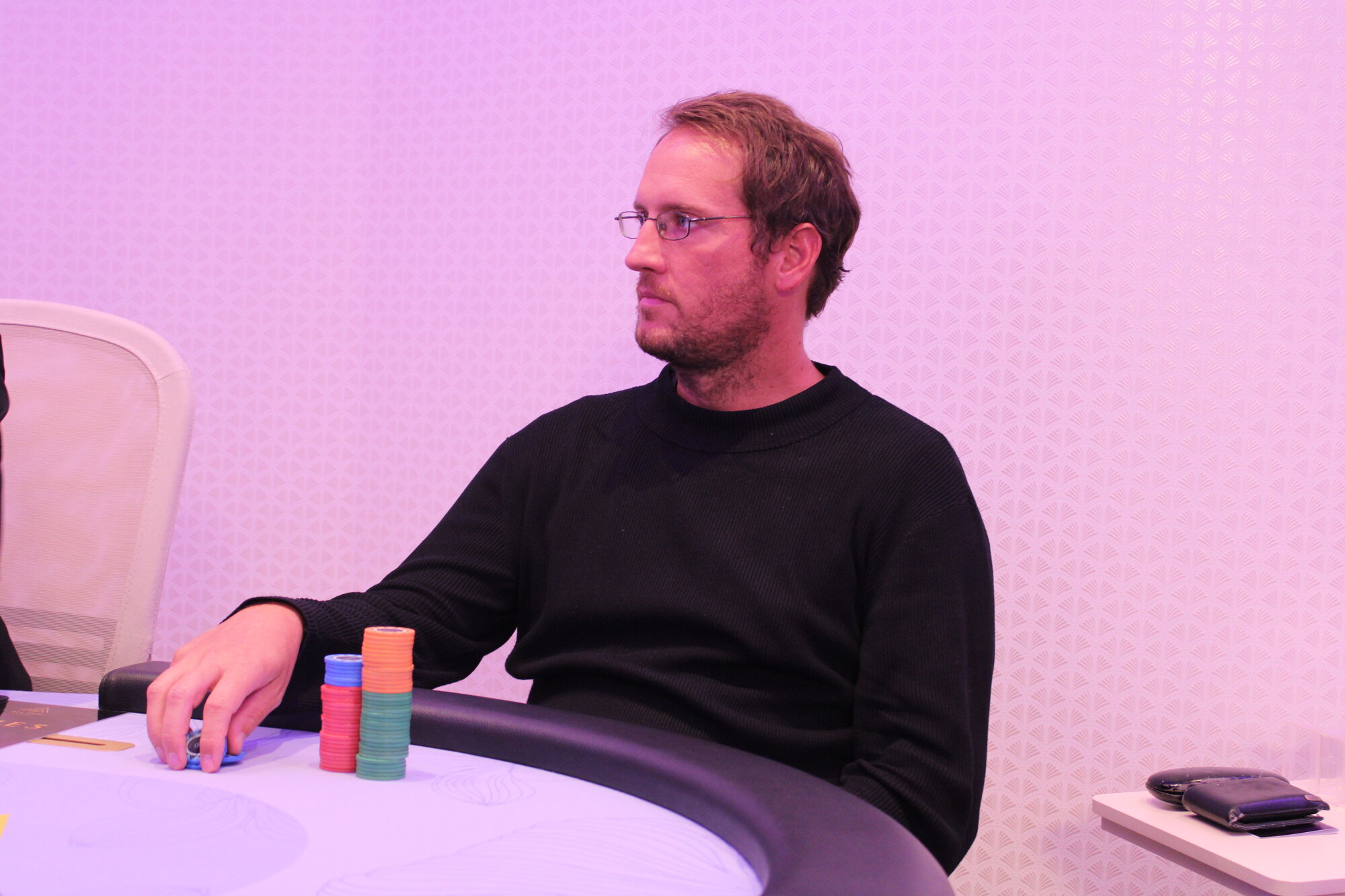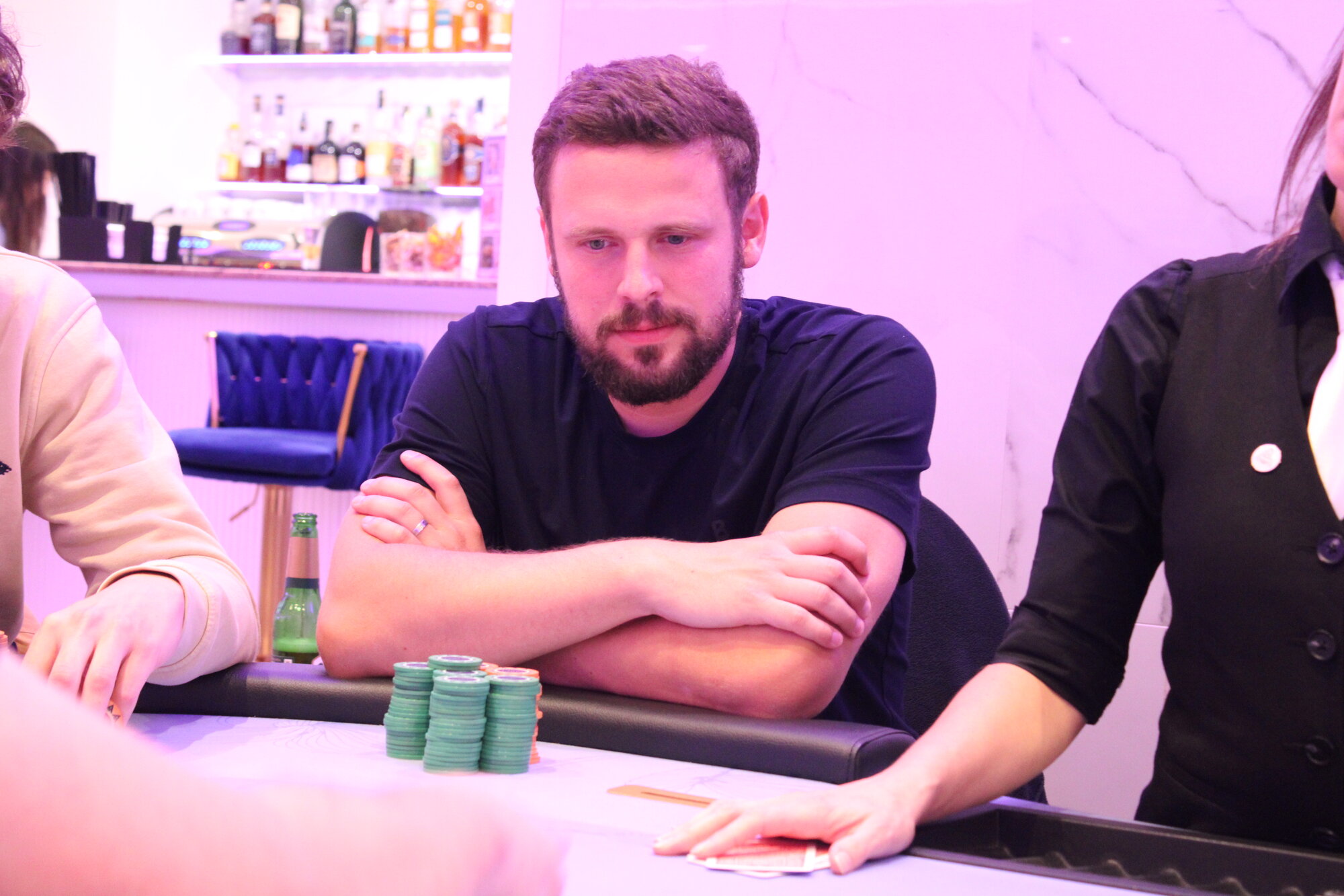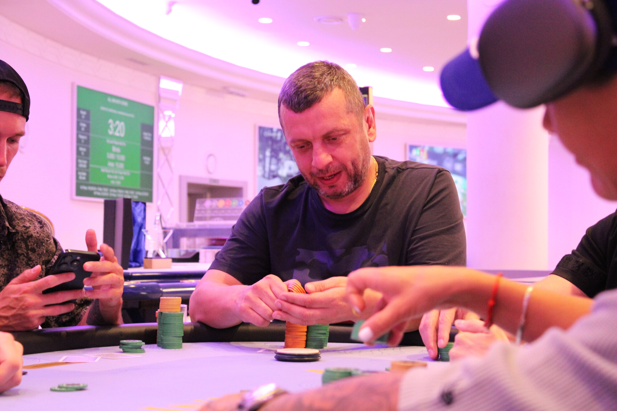 Karlovarský Král (BTN) open 150k, Marián Cmor (BB) allin 800k, call.