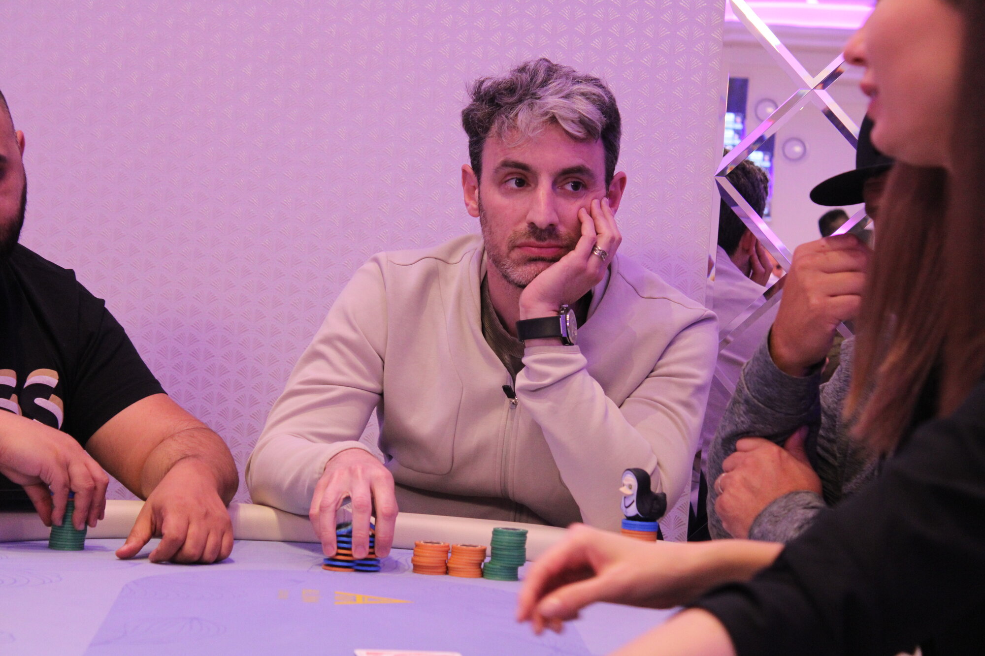 Hned první handu turnaje se v allin-call situaci na turnu, kde byly tři diamantové karty, ocitli Jiří Heidtke, Ory Weihs a Marián Cmor.