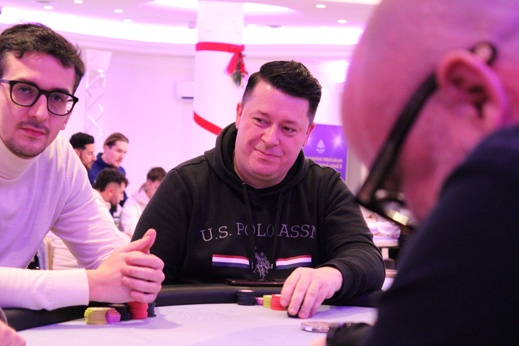 Petr Hrůzek (UTG) open 32k, Vojtáno (BTN) call a Tony Felfel (BB) squeezuje allin cca 250k, Hrůzek snapcalluje a Vojtáno fold.