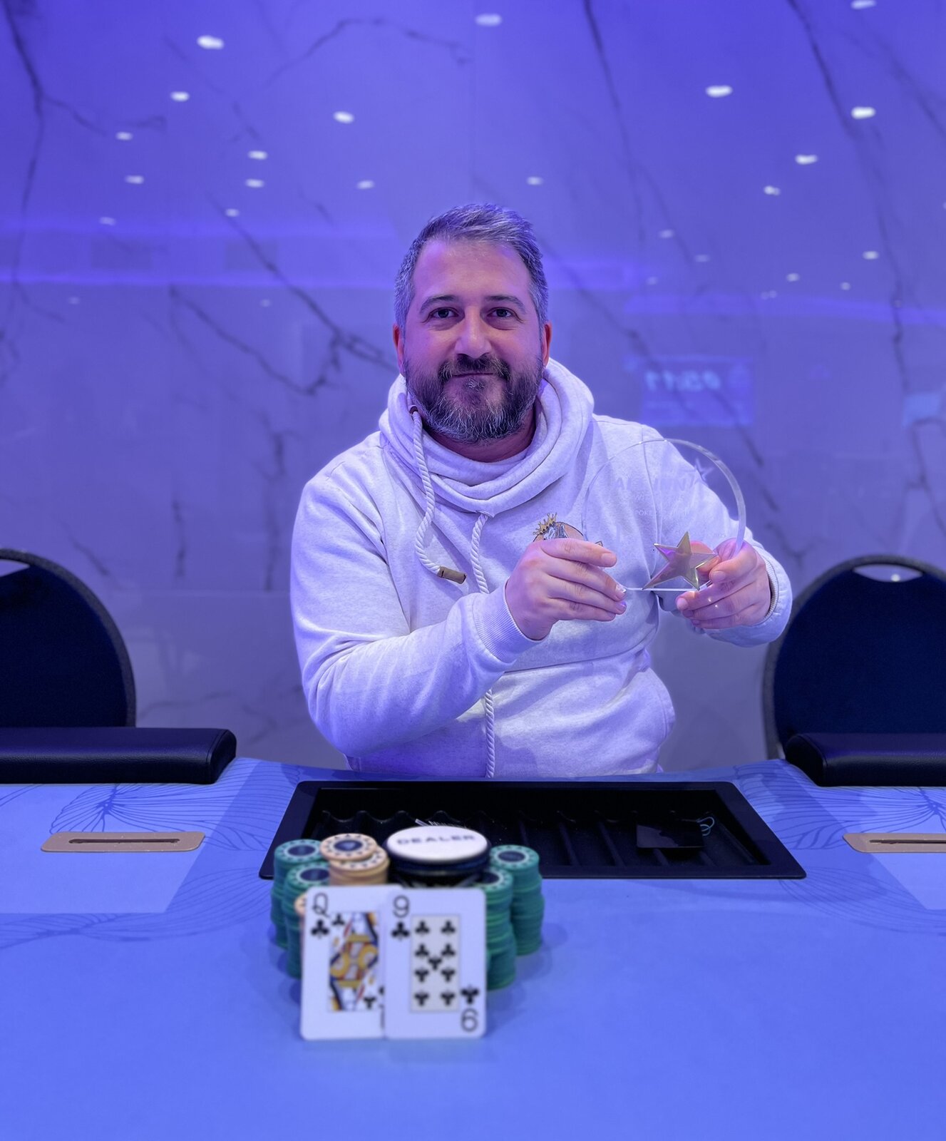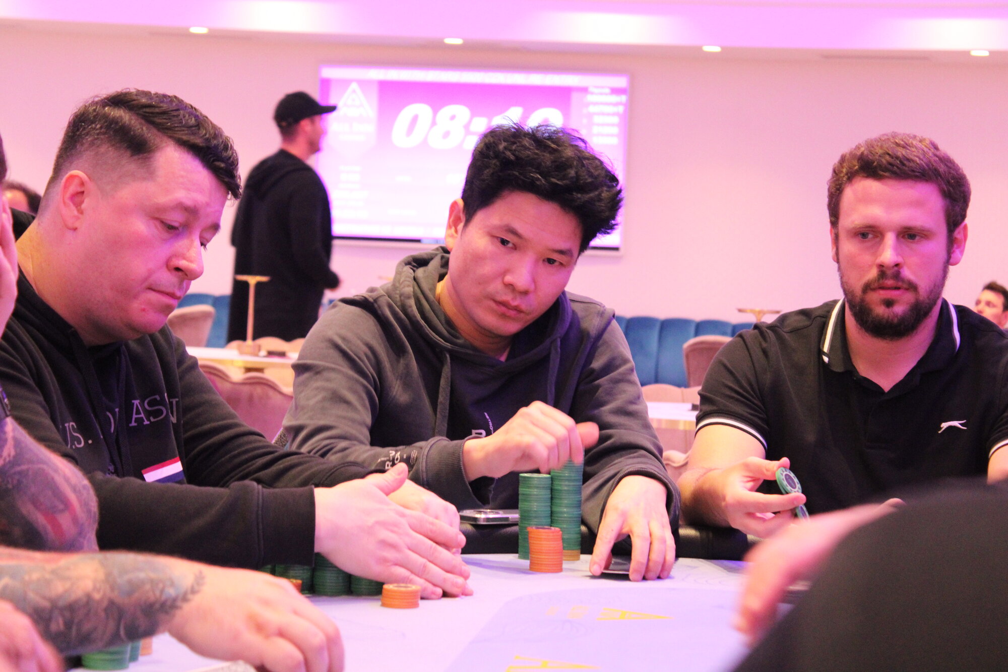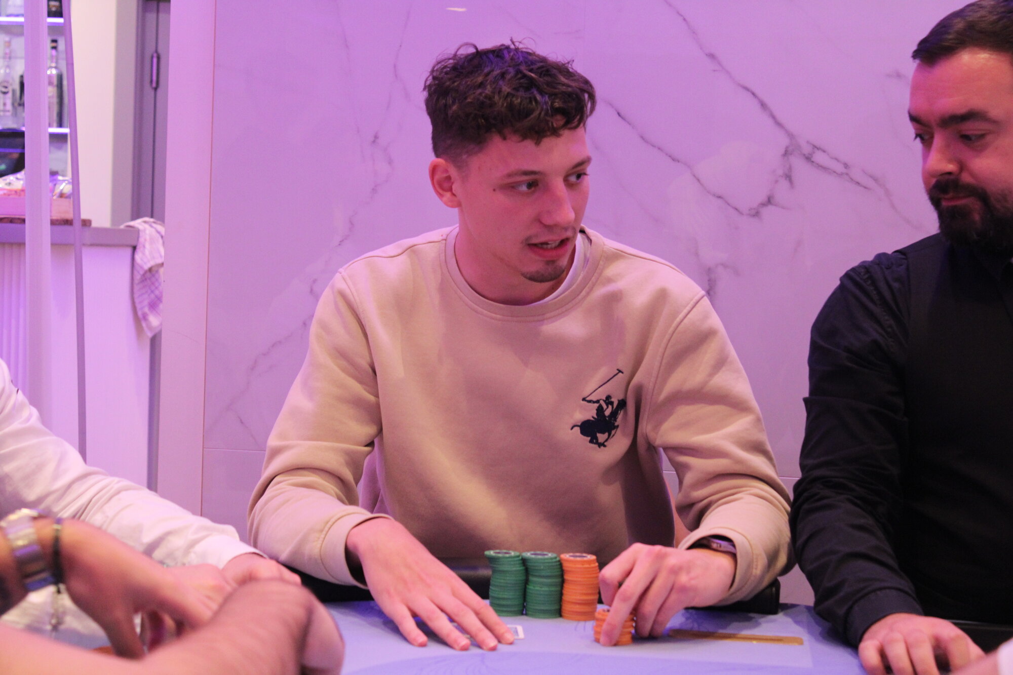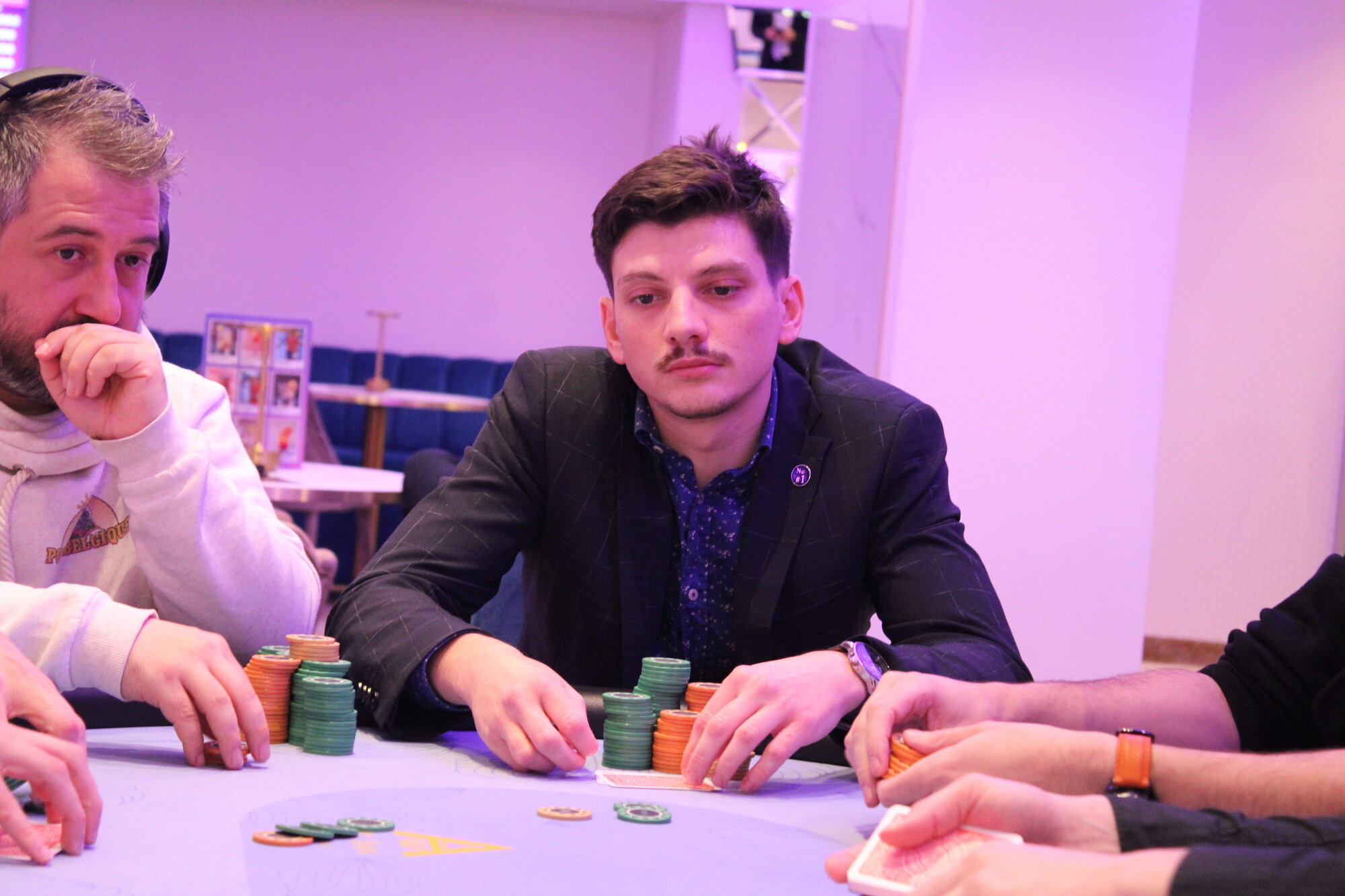 V poslední handě Jakub Schon (BTN) otevřel 64k, Leandro Gaone (SB) poslal allin za Schonovo ef. 550k a ten dovřel.