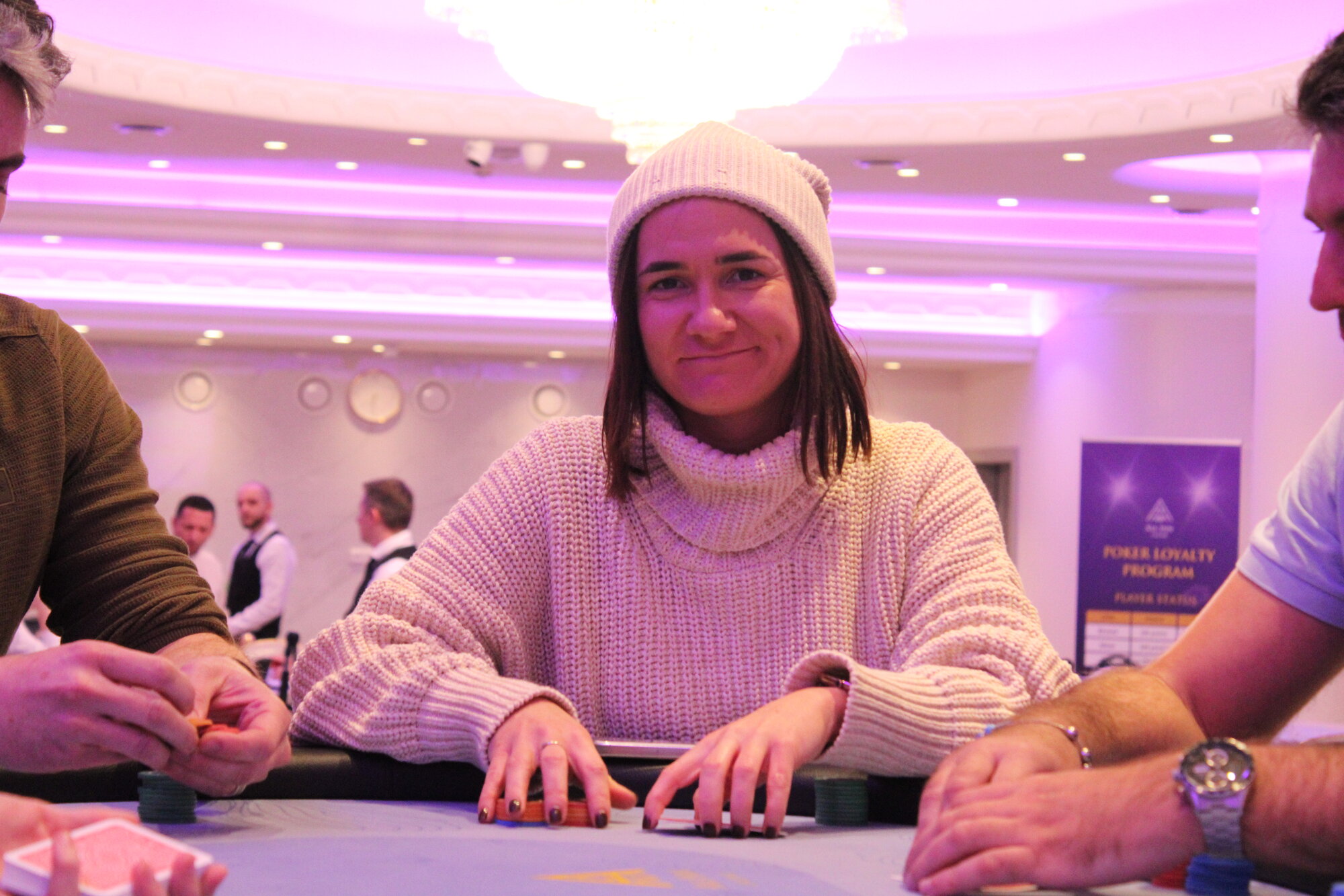 Jaromír Háněl (UTG) open 1.1k, dorovnává Anna Meissner (CO) a hráči na blindech.