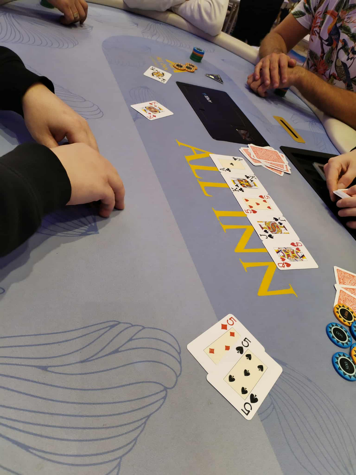 podívali čtyři hráči. Milan Kyran (BB) checknul a Karlovarský Král nasadil 500. Po callu Mariána Cmora navýší Jiří Heidtke na 1.500. Všichni call.
