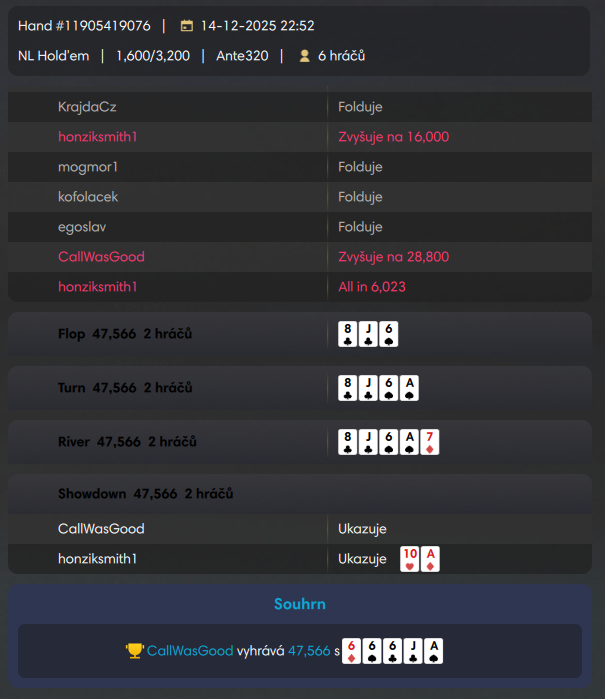 Za méně než 10 bigů s J-Q přes pár trojek Krajdy. Jack hned na flopu.