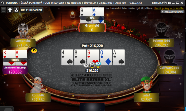 Ba naopak. Většina koleček od bývalého chipleadera JinnFromTheLamp putovala směrem k Rohlíkovi, který s avatarem Santa Clause šikanuje svůj stůl na bublině. Zbývá 28 hráčů, peníze jen pro 24 z nich.
