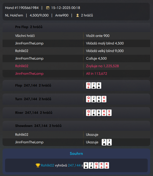 ...aby v heads-upu JinnFromTheLamp, vydržel jen několik málo her. Jinn limpnul button, Rohlík vyslal allin s K