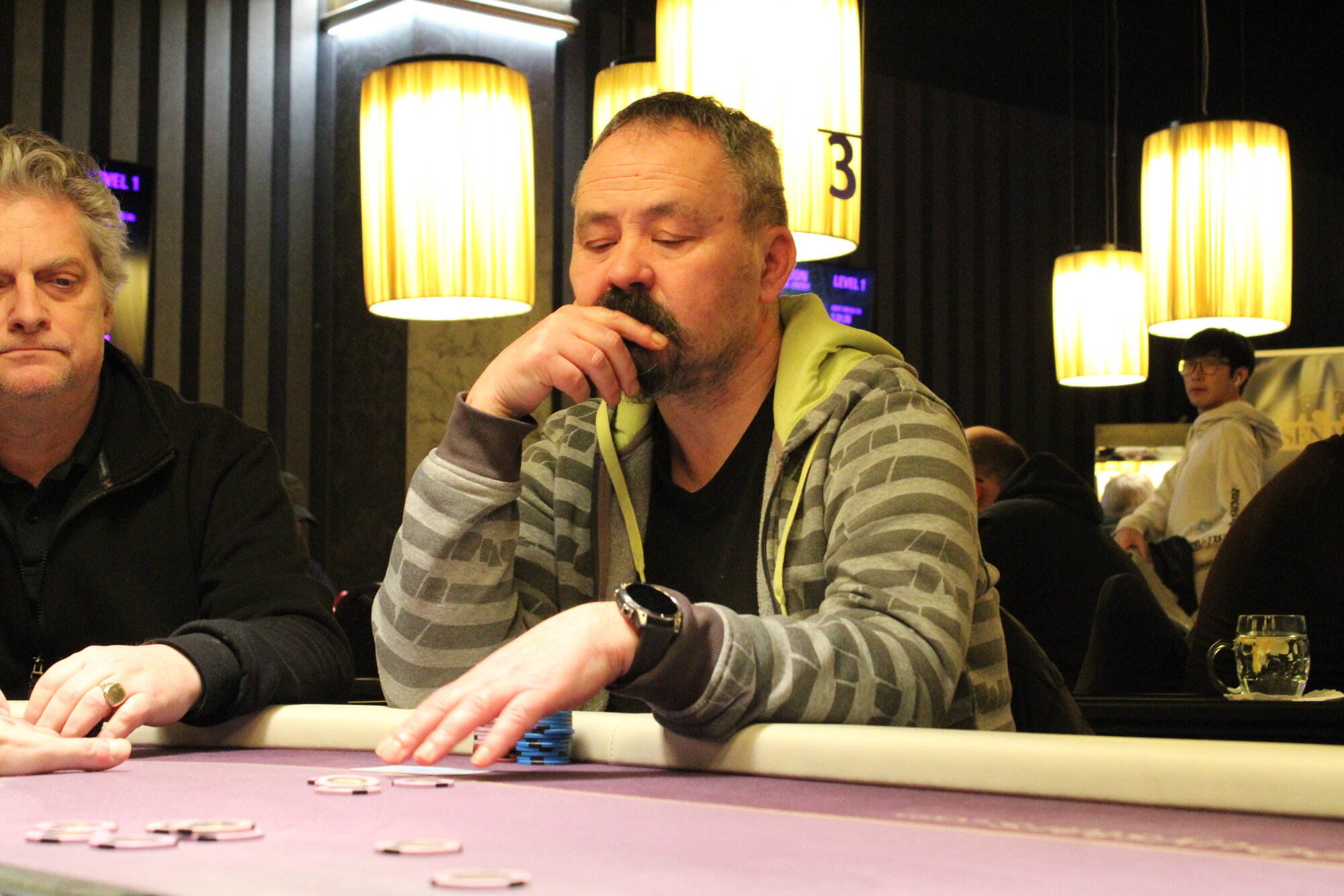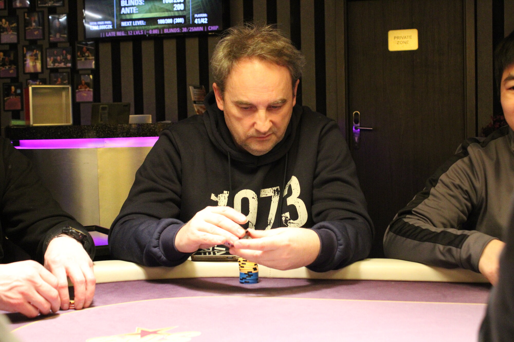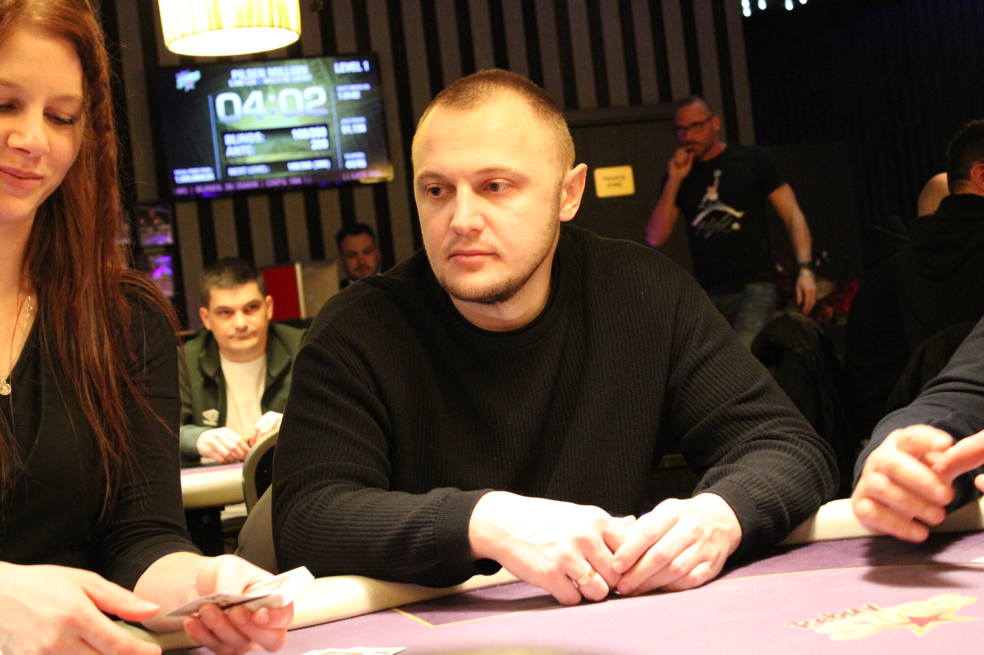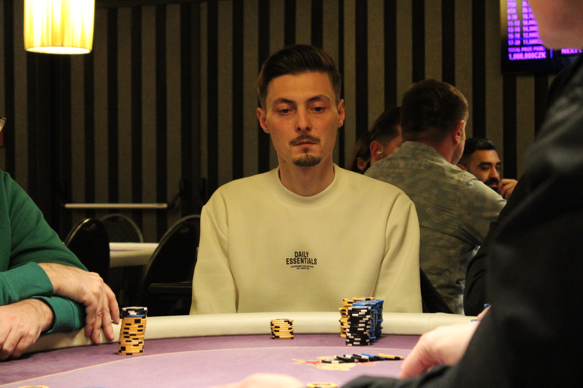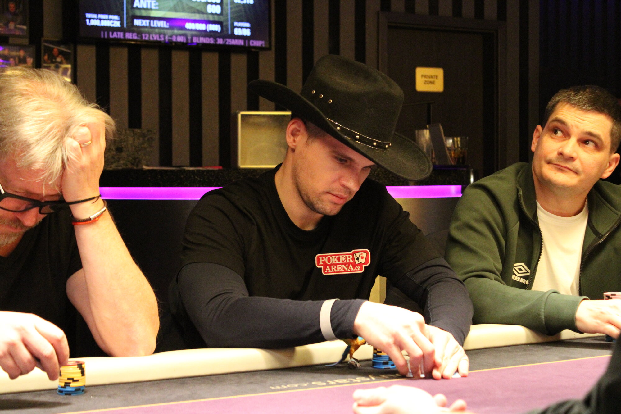 David Baloun (HJ) open 2k, Radovan Kdýr (SB) 3bet 14k, Daniel Žižka (BB) rovnou shoveuje cca 50k, Baloun zahazuje a Kdýr s větším stackem dorovnává.
