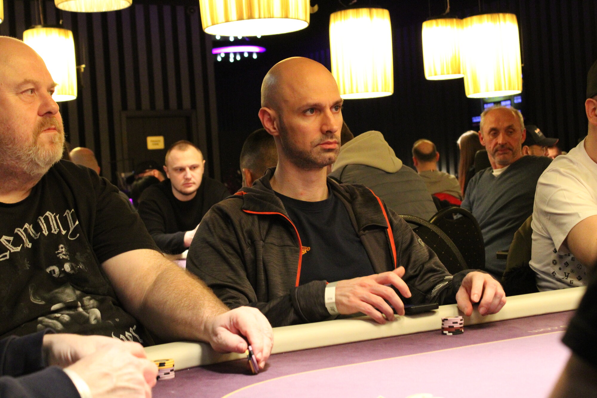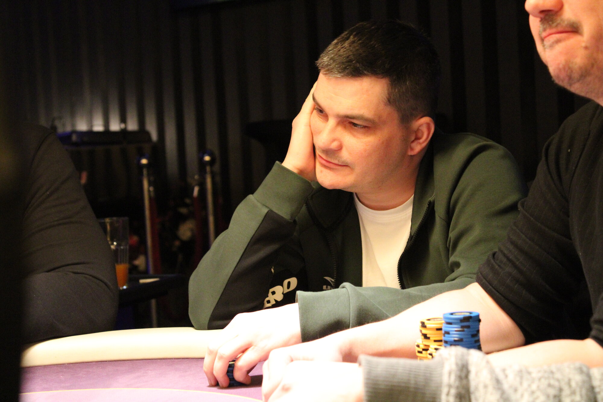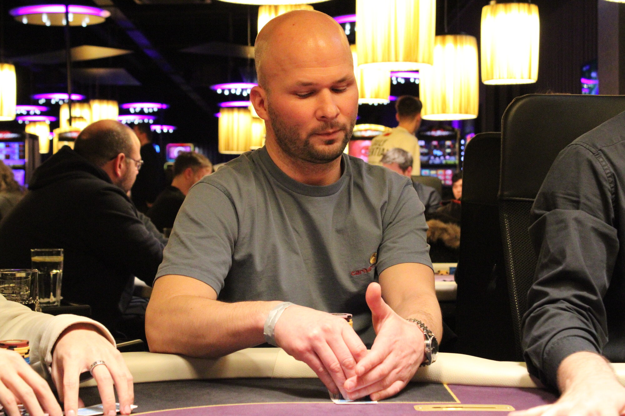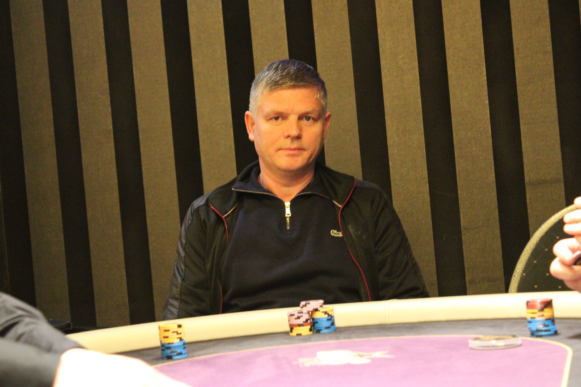 David Baloun (HJ) open 2k, Radovan Kdýr (SB) 3bet 14k, Daniel Žižka (BB) rovnou shoveuje cca 50k, Baloun zahazuje a Kdýr s větším stackem dorovnává.