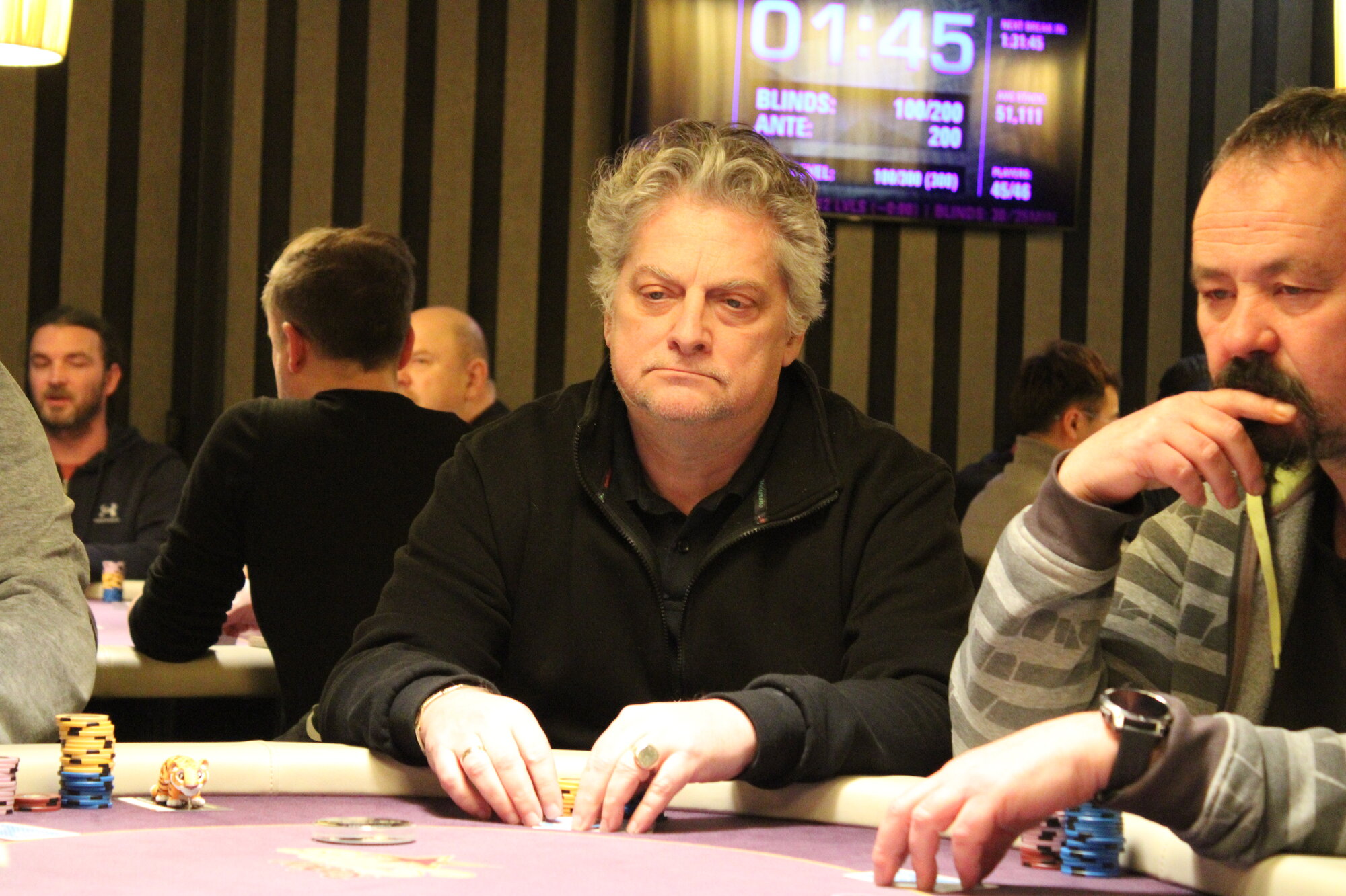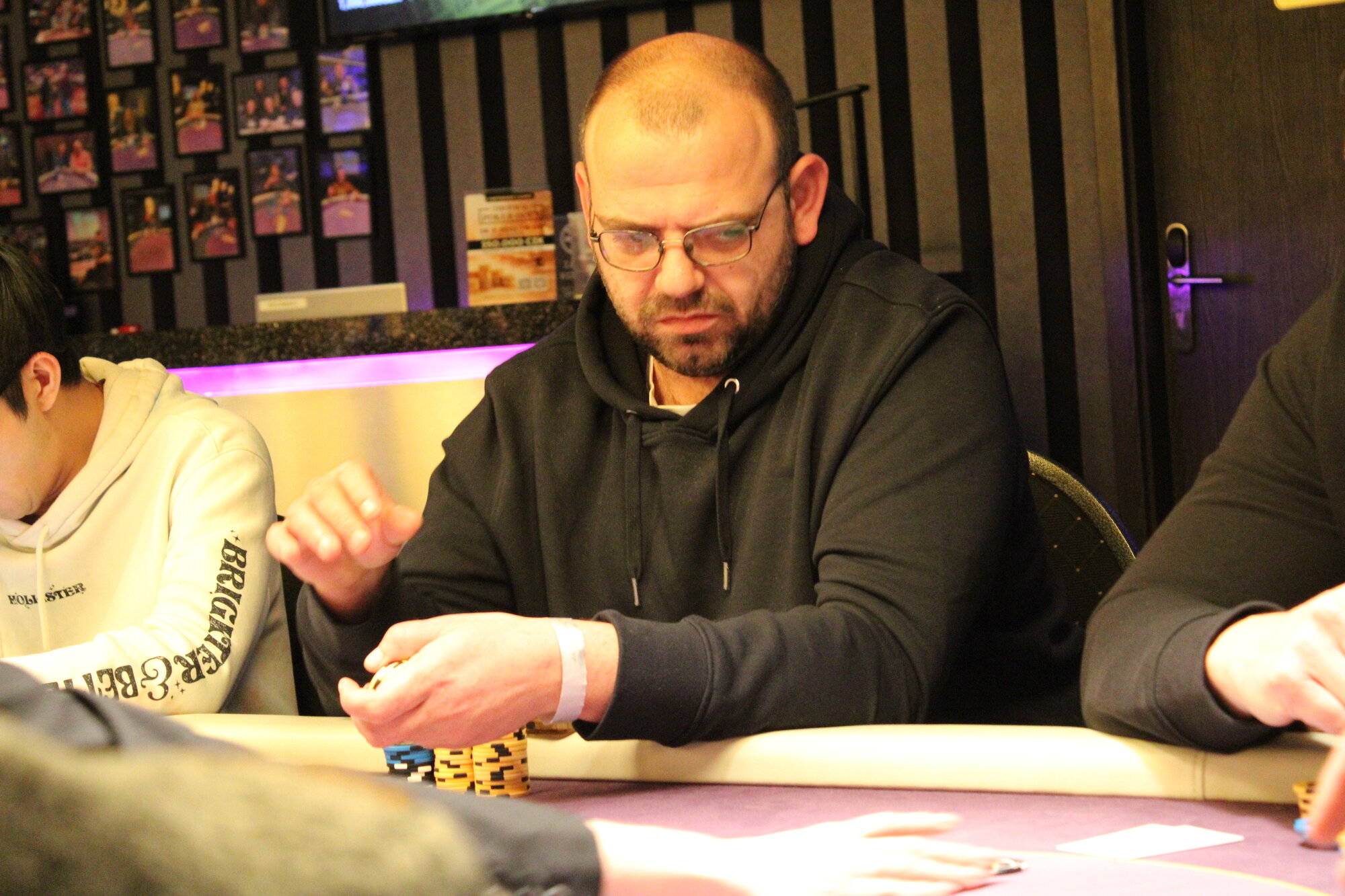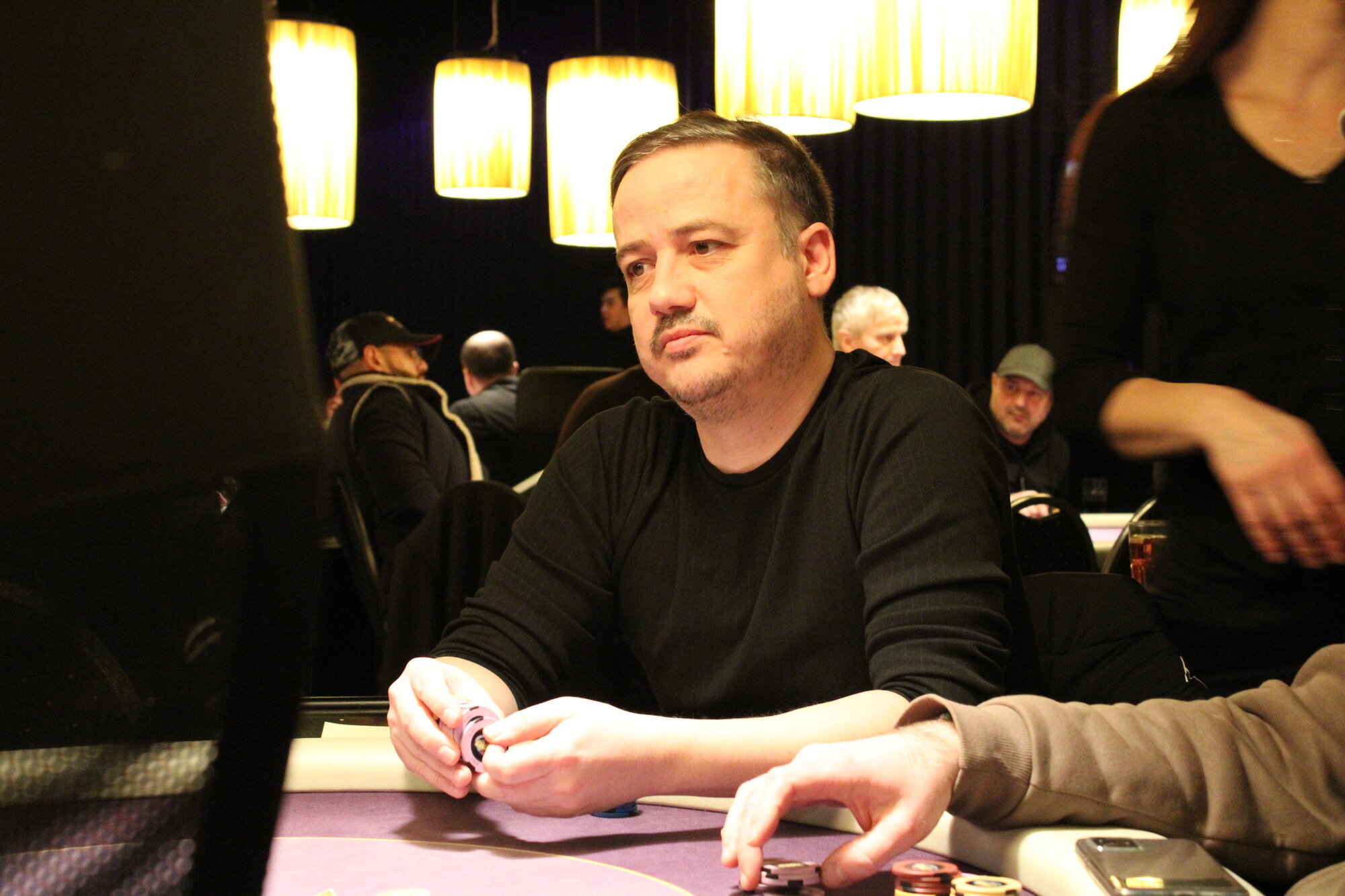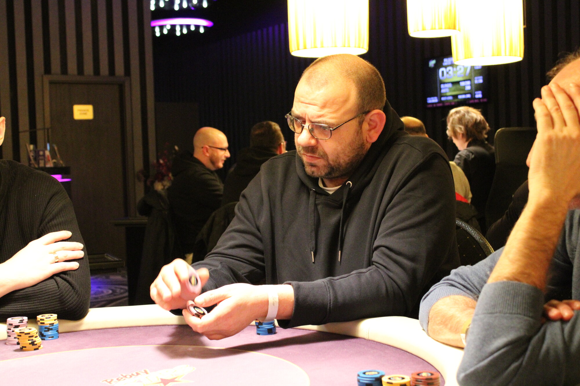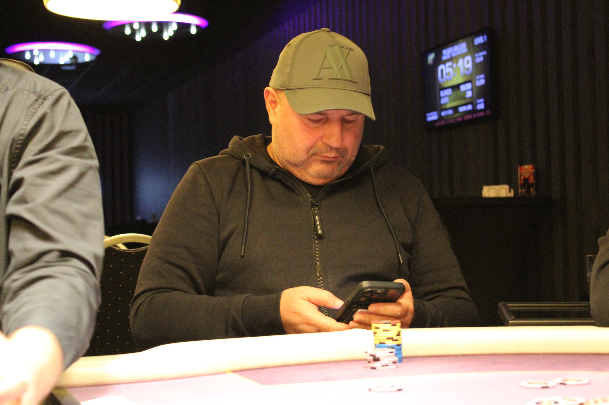 David Baloun (HJ) open 2k, Radovan Kdýr (SB) 3bet 14k, Daniel Žižka (BB) rovnou shoveuje cca 50k, Baloun zahazuje a Kdýr s větším stackem dorovnává.