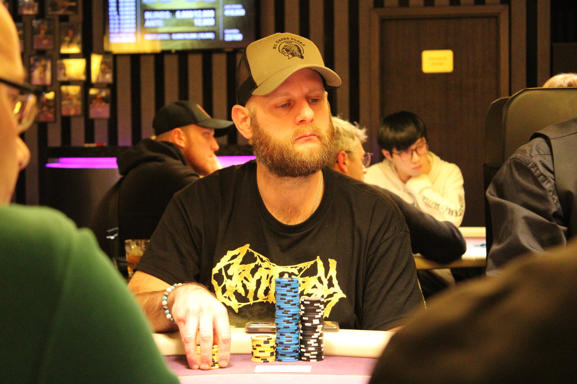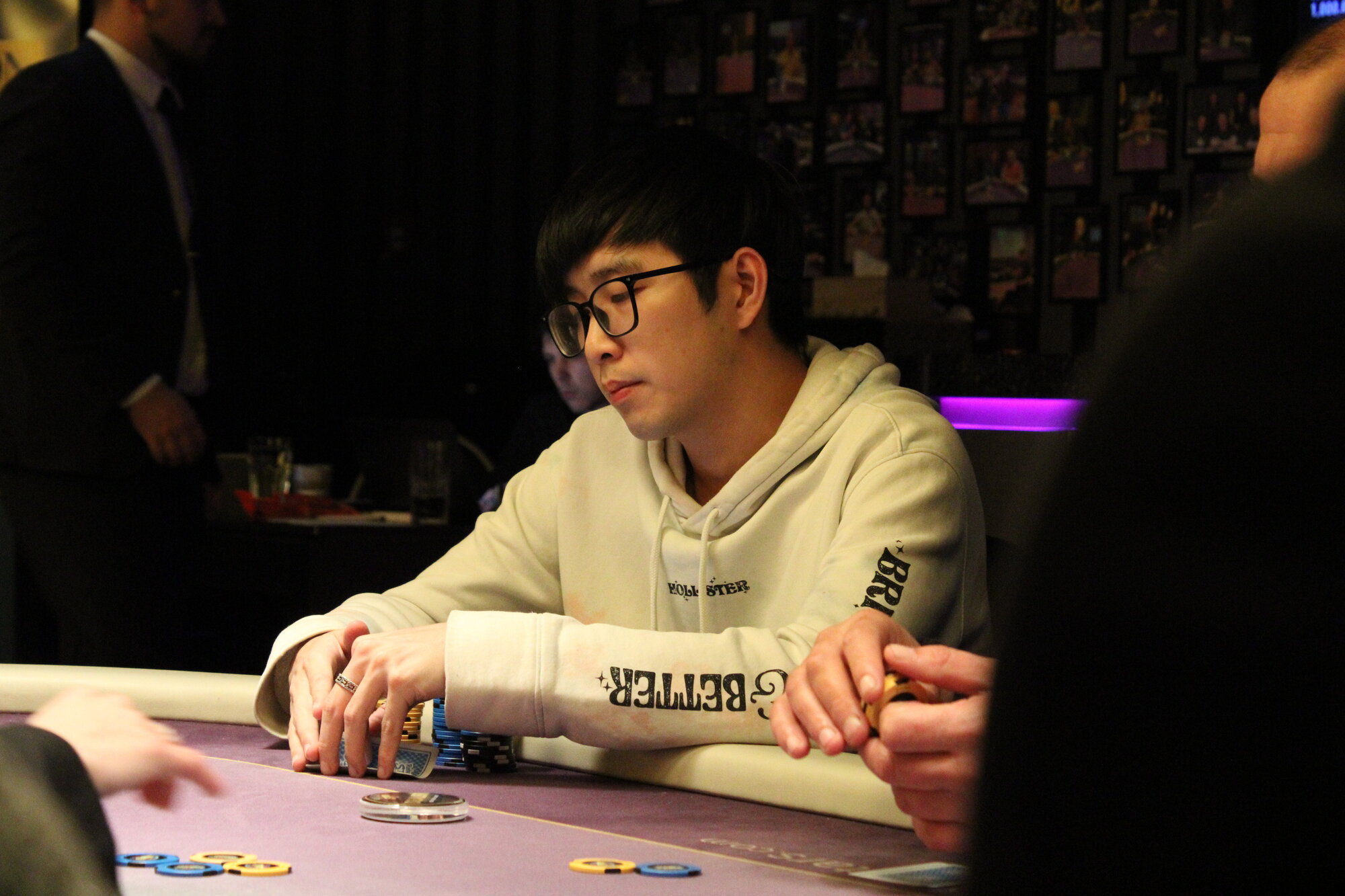 David Eiselt (BTN) open 425k, Pavel G (SB) allin 610k, Li Zichaio (BB) reshove allin a Eiselt muckuje.