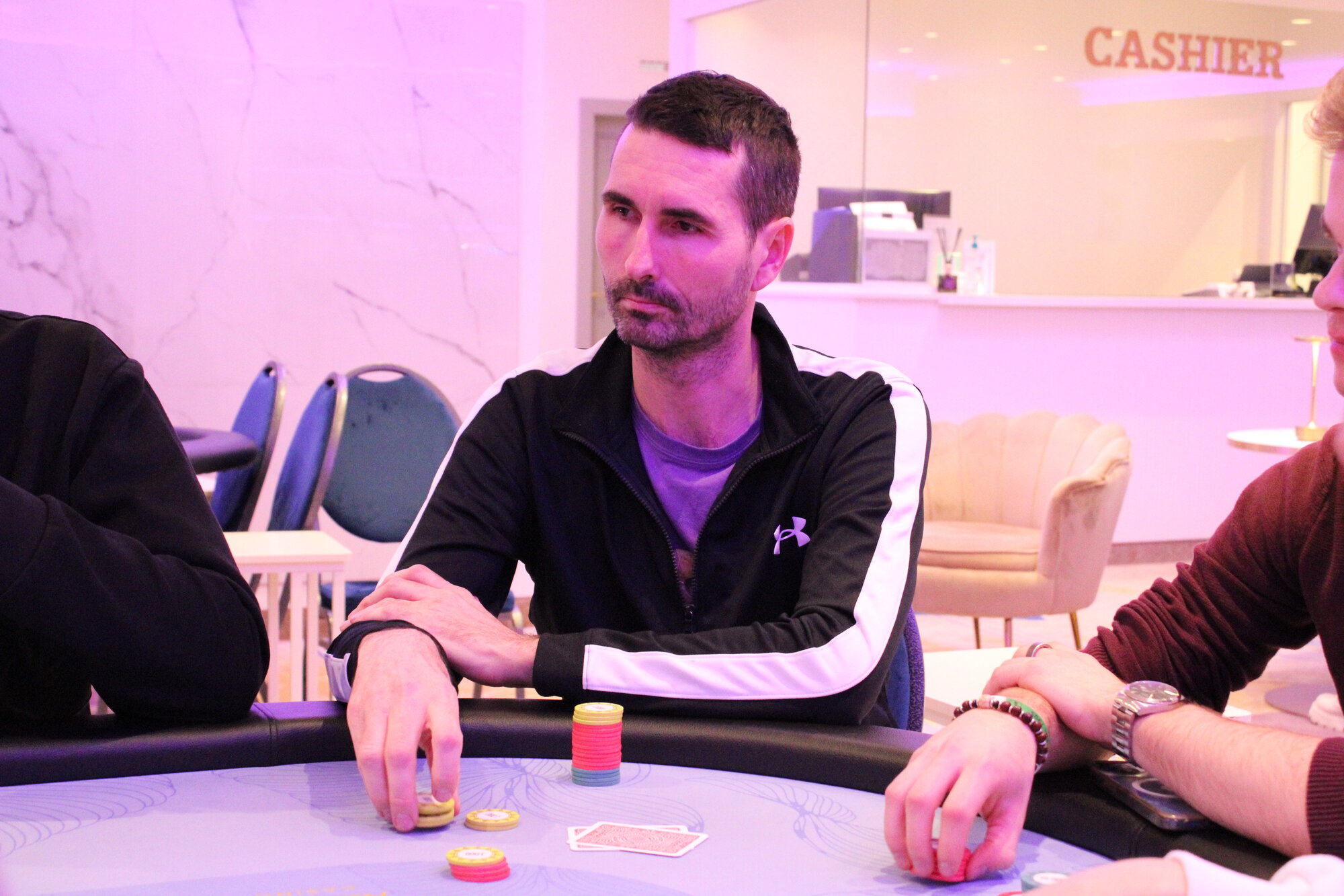 Na turnu, po checku soupeřů, betuje Král v pozici 17.5k, Anonym doorvnává za svých 13k a Nováček muckuje.