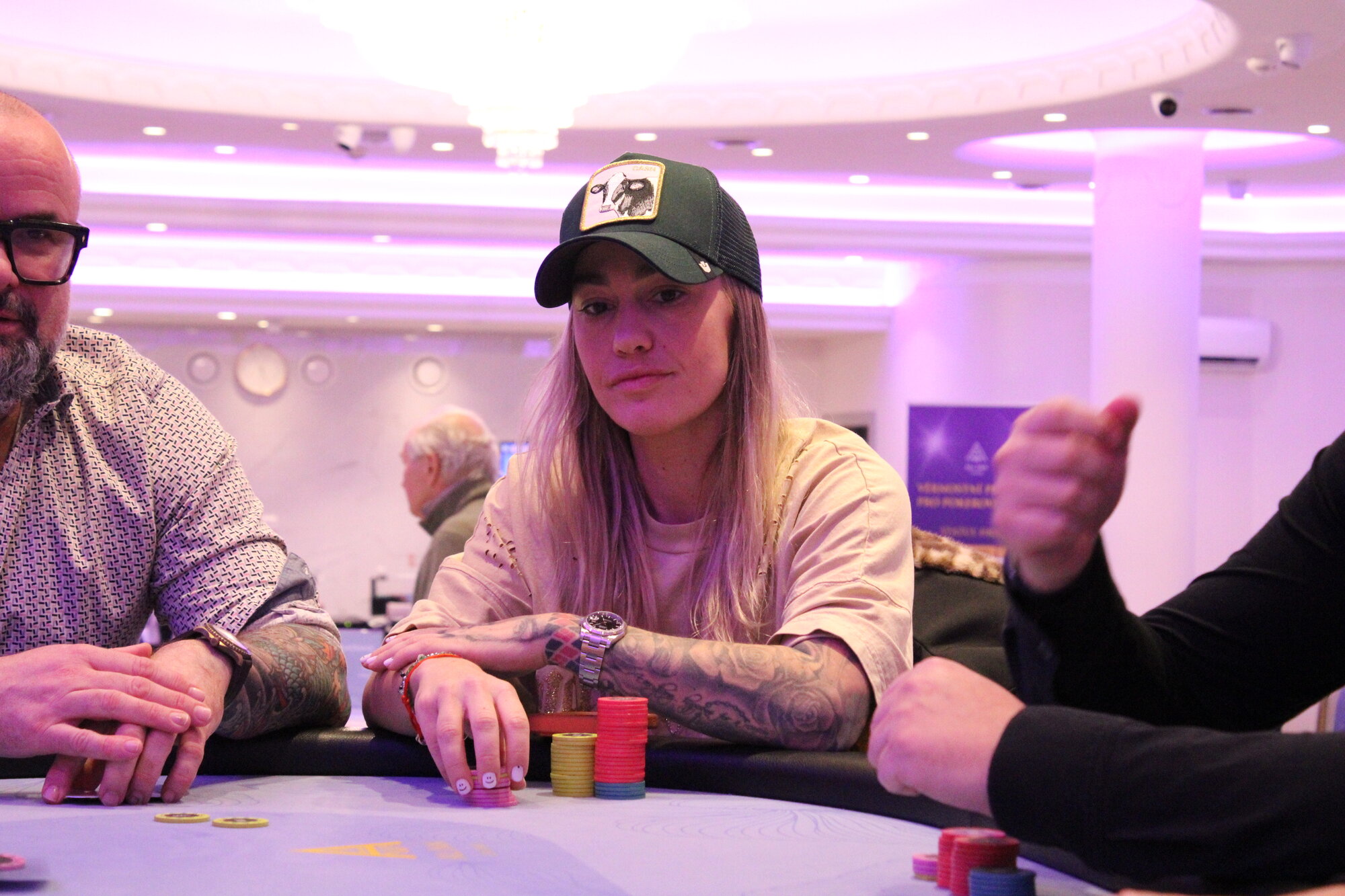 Do turnaje se zapojuje kromě jiných také Jan Bogáš, který z UTG otevírá hru za 1k, Vít Šikula (CO) dorovnává a Monika Sedláčková (BTN) 3betuje 3k, call, call.