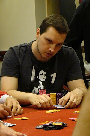 Boužel David Táborský právě vypadnul. Poslední jeho hra vypadala takto: Staropoli si limpnul K-Q a za ním David pushnul s A-9. BB zahodil. Flop: K-10-J dal Davidovi gutshot,ale zároveň pár králů Staropolimu. Turn: K a River: 4 poslali Táborského ke kase a domů, kde může pokračovat on-line. Určitě se sluší Táborskému pogratulovat k pěknému třetímu místu a odměně €3.970!
