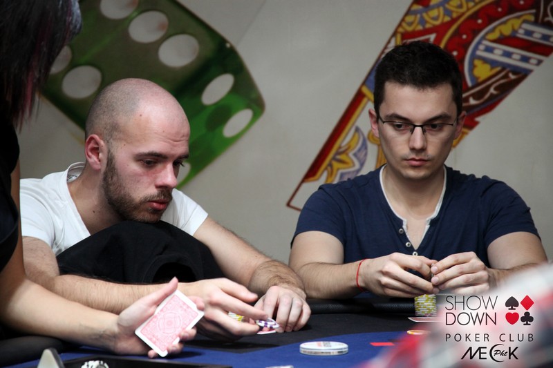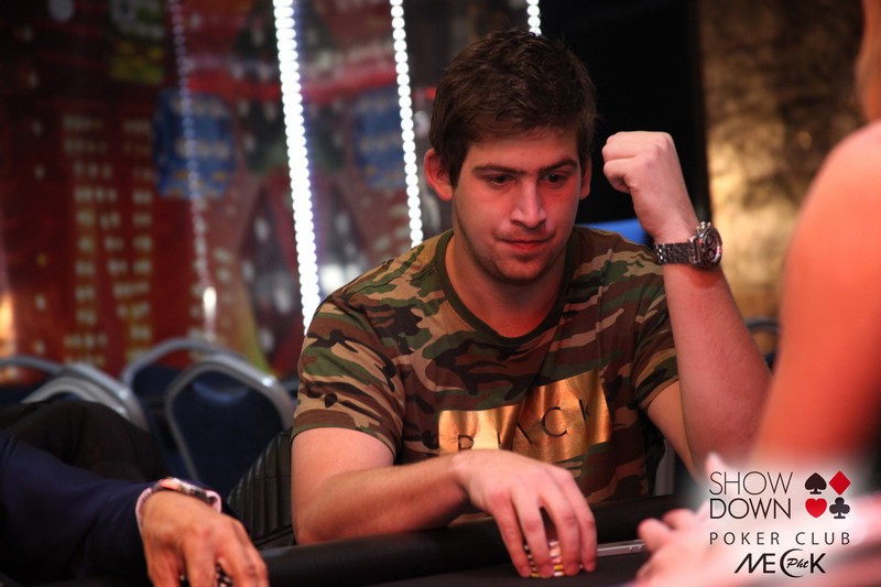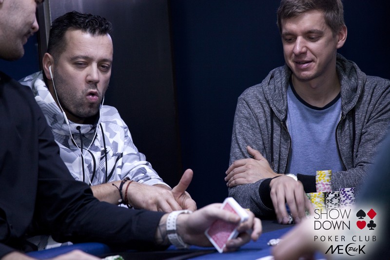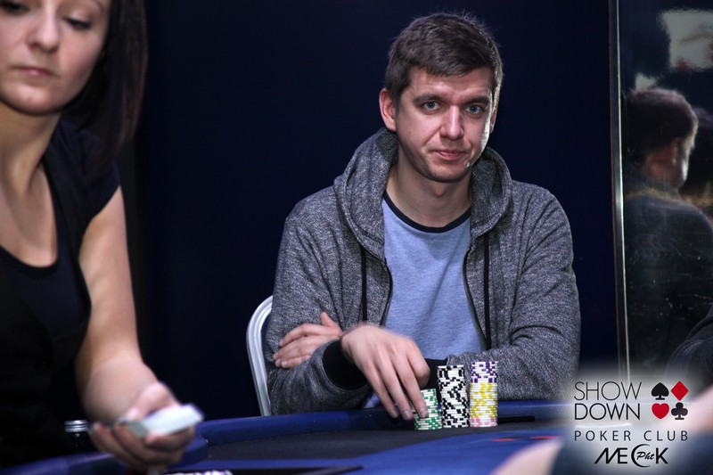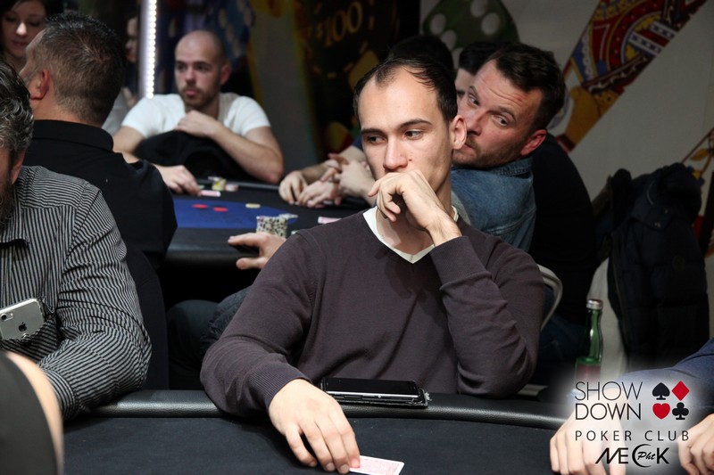 Martin Nikolov nejprve nabral nějaká kolečka na Viktoru Uhlířovi a následně vyřadil na flopu A-Q-J jednoho ze soupeřů za full stack. Martin v showdownu ukázal J-J proti soupeřovu A-K, turn 8 ani river K na rozložení sil nic nezměnili.