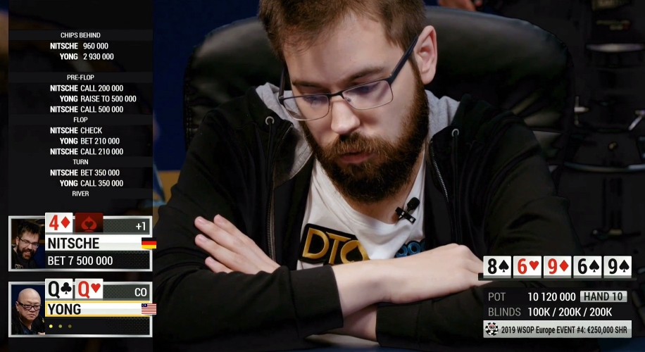 Nitsche se zamyslí a z pozice chipleadera zatlačí na blížící se bublinu velkým allinem. Oba soupeři zahodí.