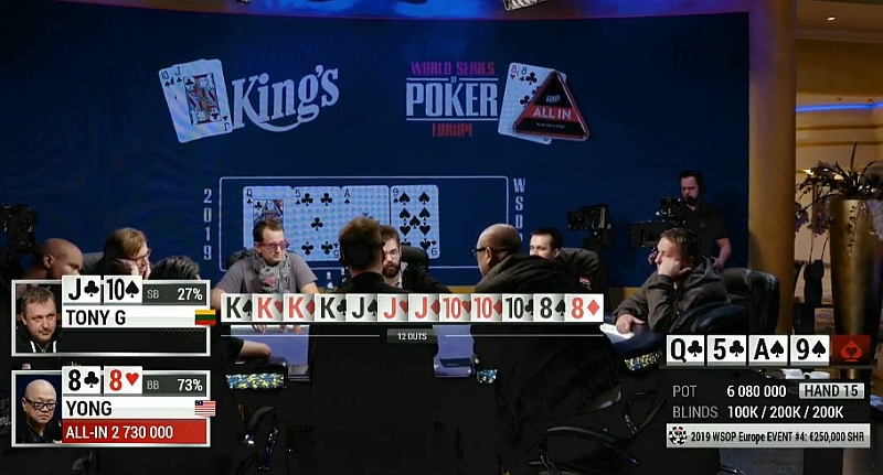 V Super High Rolleru zbývá sedm nejlepších hráčů, kteří se v pátek ve velkém finále utkají o pět ITM pozic a především titul a WSOPE náramek! Chipcounty za moment.01:28 - Tony G dvojnásobí
